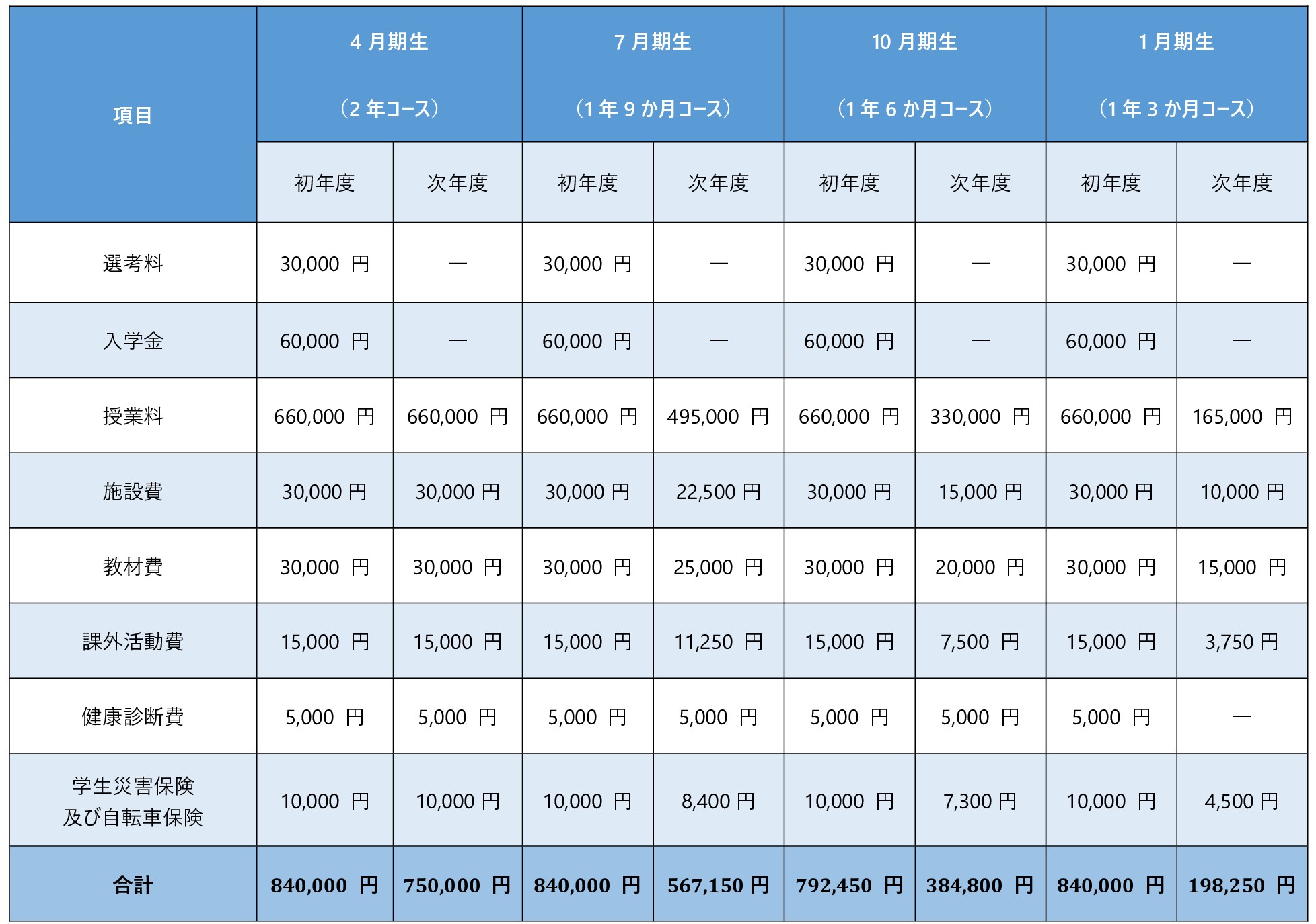 - 入学を辞退する場合、3月末(4月入学)・6月末(7月入学)・9月末(10月入学)・12月末(1月入学) までに申し出があった場合は、授業料、教材費を返還します。 選考料及び入学金は返還できません。ただし、海外送金等の手数料について、申請人の負担となります。